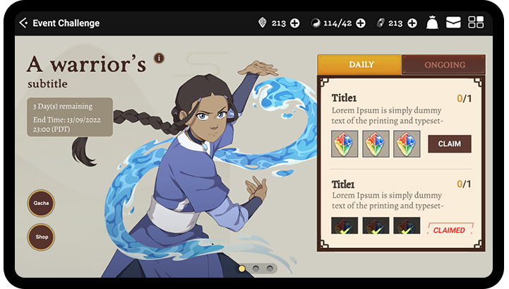 The Avatar: The Last Airbender mobile game was released in 2023 for both iOS and Android platforms and was built using Unity. I have been part of the team since the project's inception, contributing to the creation of the design proposal deck for Square Enix, the investor. As a UI/UX designer, I played a key role in managing complex UX flows that involved multiple teams. I closely collaborated with other designers to enhance the game's overall quality.